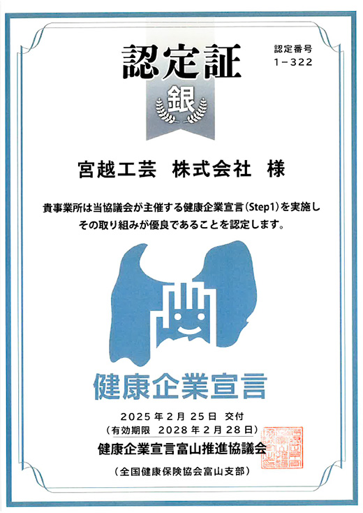 2022年2月22日、健康企業宣言富山推進協議会より、『健康企業宣言STEP1認定証』を頂きました。